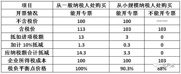 結(jié)論:在能取得增值稅專(zhuān)用發(fā)票的情況下,小規(guī)模納稅人的含稅價(jià)應(yīng)該比一般納稅人便宜10元(價(jià)格為一般納稅人價(jià)格的91.2%);價(jià)格高于91.2%,從一般納稅人處購(gòu)買(mǎi)更合算,反則反之。如果小規(guī)模納稅人不能開(kāi)專(zhuān)票,小規(guī)模納稅人的含稅價(jià)應(yīng)該比一般納稅人便宜12.25元(價(jià)格為一般納稅人價(jià)格的89.2%);價(jià)格高于89.2%,從一般納稅人處購(gòu)買(mǎi)更合算,反則反之。